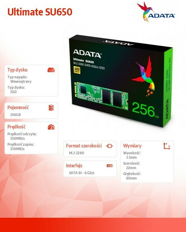 Ο SSD Adata Ultimate SU650 256GB προσφέρει αξιόπιστη και οικονομική αναβάθμιση για τον υπολογιστή σας, ιδανική για καθημερινή χρήση. Με ταχύτητες ανάγνωσης/γραφής έως 550/500MB/s, εξασφαλίζει γρήγορη εκκίνηση συστήματος, φόρτωση εφαρμογών και περιήγηση στο internet.