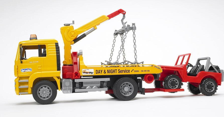 Φορτηγό Man Οδικής Βοήθειας με γερανό & τζιπάκι , από την εταιρία Bruder γνωστή για την κατασκευή στόλου οχημάτων, πανομοιότυπων με αληθινά!