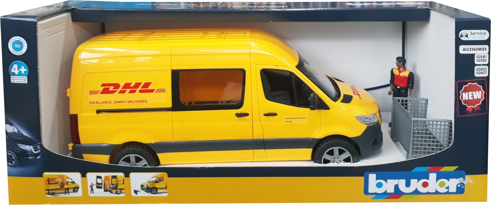 Το μοντέλο BRUDER προσφέρει την τελευταία έκδοση του Sprinter ως βαν DHL. Η πόρτα της καμπίνας του οδηγού και οι πίσω πόρτες ανοίγουν. Ένα ιδιαίτερο χαρακτηριστικό είναι η νεοαναπτυγμένη συρόμενη πόρτα από την πλευρά του συνοδηγού. Το μοντέλο BRUDER είναι εξοπλισμένο με οδηγό DHL, κλουβί παλέτας και τυπικά πακέτα αποστολής της DHL. Οι μικροί μεταφορείς έχουν τώρα ένα σύνολο με υψηλή παικτική αξία.