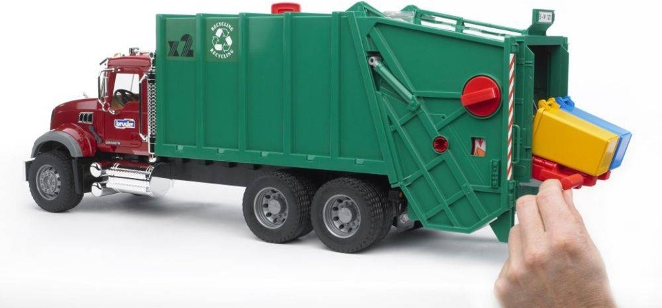 Η απίστευτα ρεαλιστική καμπίνα του οδηγού με τις πόρτες που μπορούν να ανοίξουν, το κεκλιμένο καπό κινητήρα, παρέχοντας θέα στο μπλοκ του κινητήρα, τους αναδιπλούμενους καθρέφτες και τα πολλά πρόσθετα αξεσουάρ, που δίνουν στο μοντέλο τη χρωματική του εμφάνιση. αυτό το φορτηγό είναι μια πραγματική γιορτή για τα μάτια κάθε ανεμιστήρα φορτηγού. Όταν χρησιμοποιείται ως απορριμματοφόρο, αυτό το φορτηγό καταφέρνει να συναρπάσει τα παιδιά με την ανακύκλωση και τη διαχείριση απορριμμάτων. Οι μικροί κάδοι σκουπιδοτενεκέ (περιλαμβάνονται) ή οι γκρι κάδοι απορριμμάτων (δεν περιλαμβάνονται) μπορούν να αδειάσουν χρησιμοποιώντας έναν πλήρως λειτουργικό ανυψωτήρα απορριμμάτων. Μπορούν να ανοίξουν τόσο τα χρωματιστά κάδο απορριμμάτων όσο και το δοχείο απορριμμάτων. Όπως και στην πραγματική ζωή, ένας πρέσα εργασίας μεταφέρει τα σκουπίδια στο εσωτερικό δοχείο φόρτωσης, το οποίο μπορεί να αδειάσει γέρνοντας την πίσω πόρτα. η πίσω πόρτα θα κλειδώσει στη θέση της όταν ανοίξει.