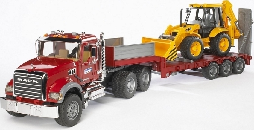 Bruder Φορτηγό Με Επικαθήμενη Καρότσα και JcbΗ “απίστευτα” ρεαλιστική καμπίνα του οδηγού με τις πόρτες που μπορούν να ανοίξουν, το κεκλιμένο καπό του κινητήρα, που παρέχει θέα στο μπλοκ του κινητήρα, οι πτυσσόμενοι καθρέφτες πίσω όψης και τα πολλά πρόσθετα αξεσουάρ, που δίνουν στο χρώμιο του, κάνουν αυτό το φορτηγό μια πραγματική γιορτή για τα μάτια κάθε ανεμιστήρα φορτηγού. Σημαντικά μέρη του εξοπλισμού είναι οι ρυθμιζόμενες λωρίδες ασφάλισης, οι οποίες προορίζονται για τη ασφάλιση των οχημάτων κατά τη μεταφορά. Οι ράμπες πρόσβασης μπορούν να διπλωθούν προς τα κάτω. Τα γλυπτά ελαστικά ολοκληρώνουν την εικόνα. Το φορτωμένο JCB Φορτωτής Backhoe έχει έναν πλήρως λειτουργικό μπροστινό φορτωτή. Το Backhoe κινείται πάνω-κάτω και ταλαντεύεται από τη μια πλευρά στην πλευρά σε αυτό το μοναδικό πρόγραμμα. Τα πόδια σταθεροποιητή αυτού του backhoe εκτείνονται στο έδαφος. Το κάθισμα κουνιέται. Τα μαλακά ελαστικά από καουτσούκ έχουν πραγματικό πέλμα.