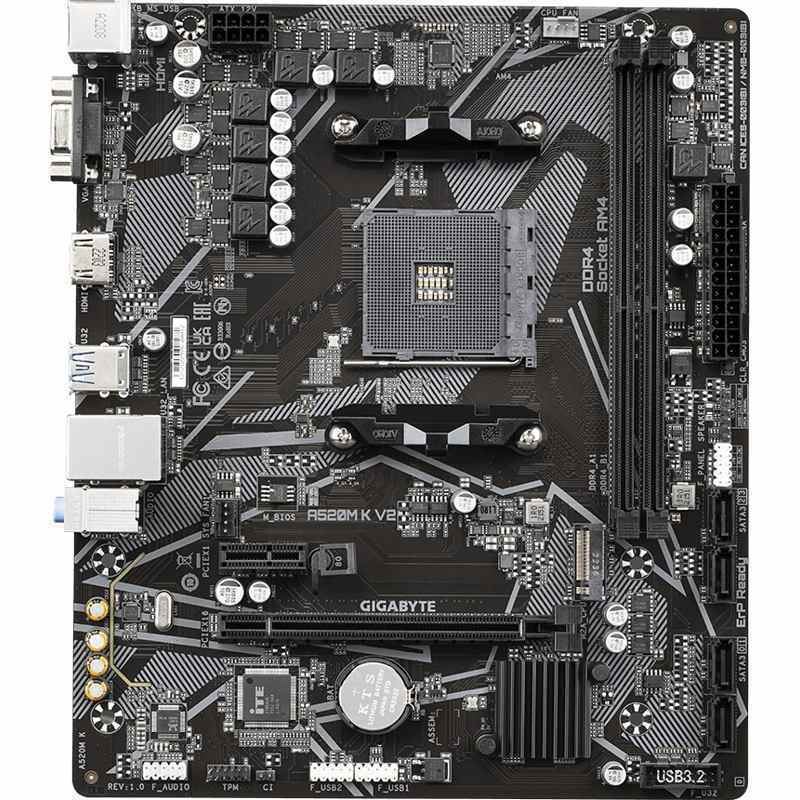 Η Gigabyte A520M K V2 rev. 1.0 διαθέτει υποδοχές PCIe 3.0 για τη σύνδεση καρτών γραφικών και άλλων περιφερειακών συσκευών. Παρέχει επίσης υποδοχές M.2 για γρήγορη αποθήκευση και μνήμες DDR4 με υψηλές ταχύτητες. Επιπλέον, περιλαμβάνει θύρες USB, ενσωματωμένη κάρτα ήχου και Gigabit Ethernet για ευκολία σύνδεσης και δικτύωσης.