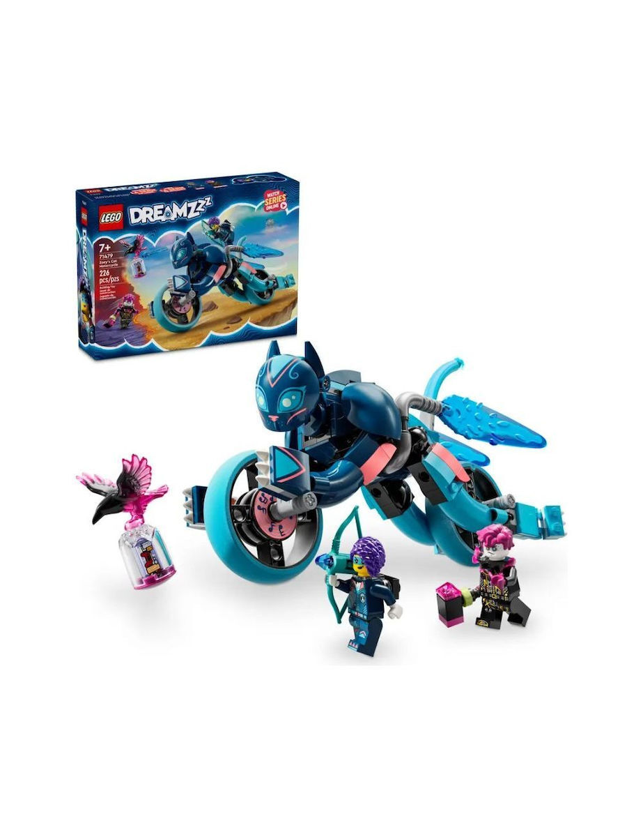 Τρέξε στον ονειρόκοσμο με τη μοτοσικλέτα της Ζόι, από τη σειρά LEGO® DREAMZzz! Το κοράκι της Μάγισσας του Ποτέ έκλεψε μια ανάμνηση από τη Ζόι. Βοήθησε να την πάρει πίσω. Κατασκεύασε μια απίθανη γάτα και μετά μεταμόρφωσέ την σε μοτοσικλέτα-γάτα μετροχούς που μπορεί να κυνηγήσει το κοράκι ή σε γρήγορη γάτα με τούρμπο προωθητήρες που μπορεί να το πολεμήσει! Ποια διαμόρφωση θα φτιάξεις πρώτα;