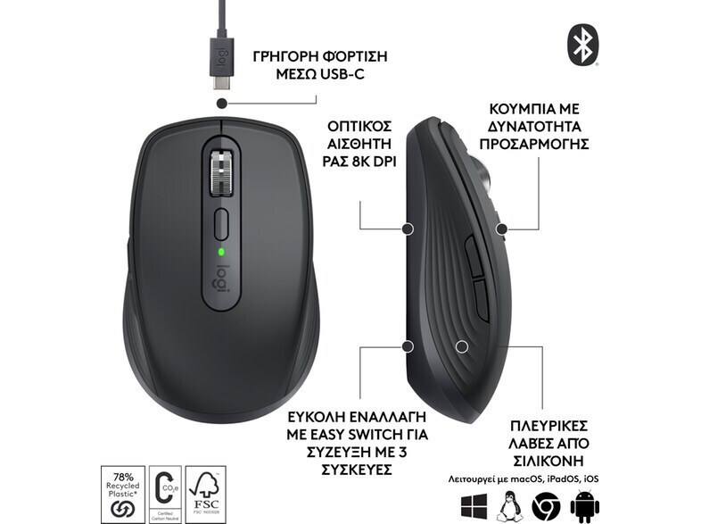 Συμπαγές, μικρό και λειτουργικό, το ασύρματο ποντίκι MX Anywhere 3 θα σε συντροφεύσει παντού. To scrolling γίνεται ταχύτατα, αθόρυβα και με απόλυτη ακρίβεια, έχει σχεδιαστεί ώστε να εφαρμόζει τέλεια με το χέρι του χρήστη, ενώ ο ειδικός αισθητήρας του σού επιτρέπει να δουλέψεις σχεδόν σε οποιοδήποτε επιφάνεια.