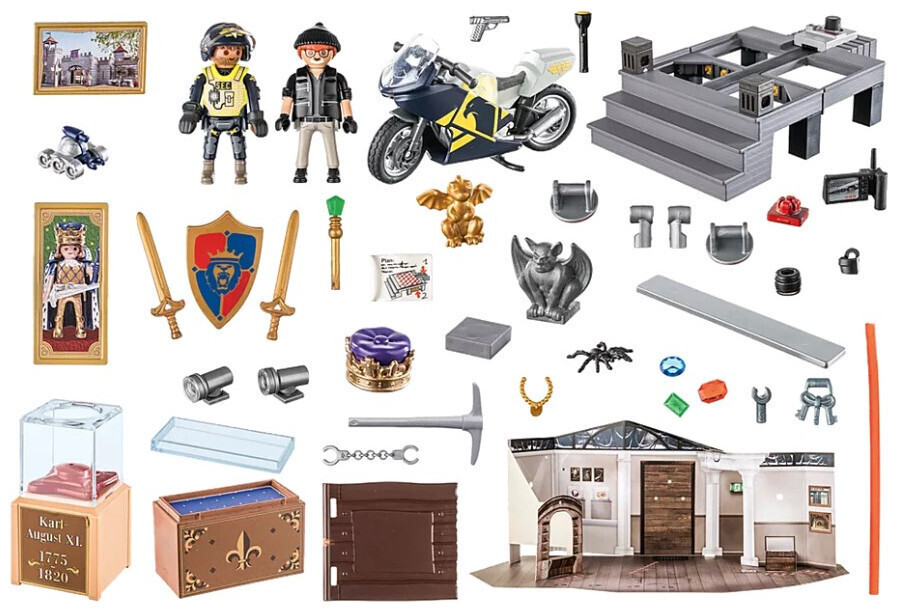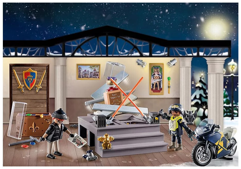 Κάντε την αντίστροφη μέτρηση για τα Χριστούγεννα πιο συναρπαστική από ποτέ με ένα δωράκι κάθε μέρα! Βρείτε 24 δωράκια-έκπληξη κρυμμένα πίσω από τα "παραθυράκια" και ζήστε την απόλυτη αστυνομική καταδίωξη στο μουσείο. Περιλαμβάνει: 2 φιγούρες PLAYMOBIL Μοτοσικλέτα Χειροπέδες Ερευνητικό ρομπότ Εκθέματα μουσείου Πολλά απίθανα αξεσουάρ Ατελείωτη διασκέδαση!