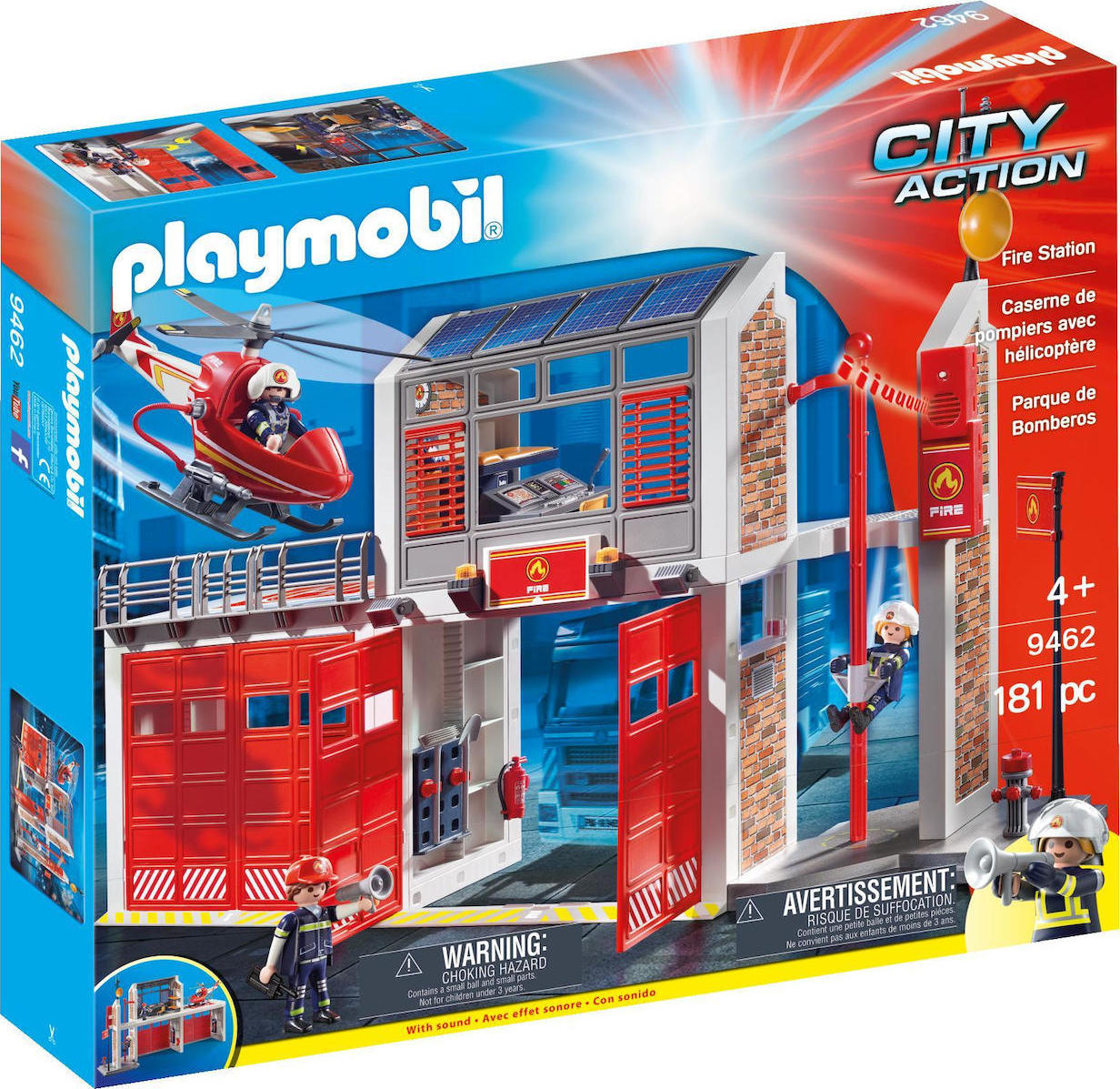 Περιλαμβάνει στύλο, ελικόπτερο και ελικοδρόμιο, συναγερμό (λειτουργεί με 2 1,5 V μικρό μπαταρίες  δεν περιλαμβάνονται ) καθώς και δύο γκαράζ για Πυροσβεστικά οχήματα.