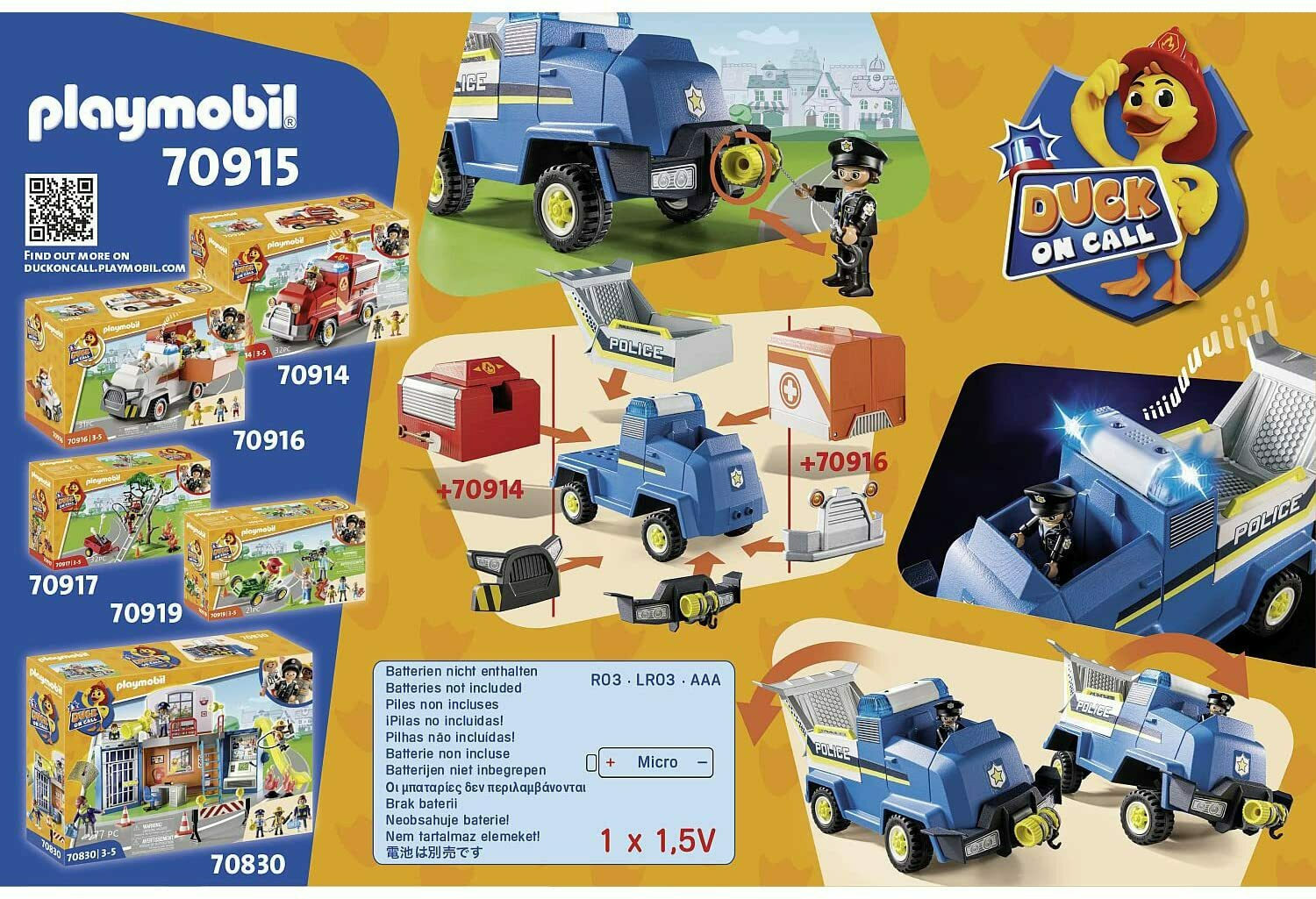 Duck on call όχημα αστυνομίας με mini περιπολικό. Είναι εξοπλισμένο με αμορτισέρ για καλύτερη οδήγηση. Μήκος οχήματος: 28 εκ. Διαστάσεις συσκευασίας: 28.4×18.7×12.4 εκ. Κατάλληλο για ηλικίες 3+ ετών Περιλαμβάνει 35 κομμάτια