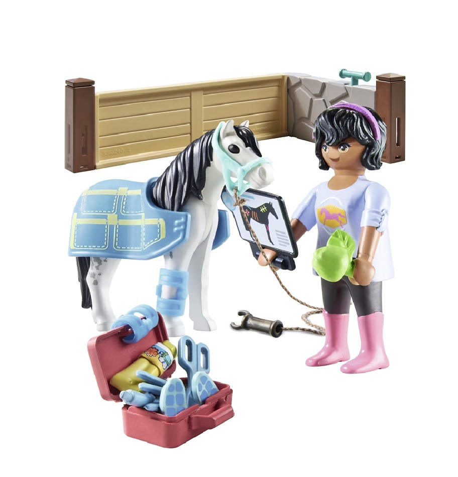 Έρχεται με μία φιγούρα PLAYMOBIL, άλογο, κουβέρτα αλόγου, επιδέσμους και πολλά άλλα αξεσουάρ για τη φροντίδα του αλόγου.