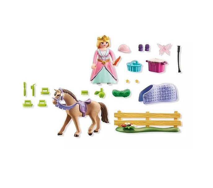 Η πριγκίπισσα μπορεί να αλλάξει το στέμμα της με κράνος ιππασίας και γάντια, έτοιμη για κάθε περιπέτεια. Ένα πεταλούδα πετά κοντά καθώς εξερευνούν το καταπράσινο περιφραγμένο λιβάδι. Με σαμάρι, καλάθι γεμάτο λιχουδιές και ένα θησαυρό αξεσουάρ, αυτό το σετ PLAYMOBIL εμπνέει μαγευτικές ιστορίες!