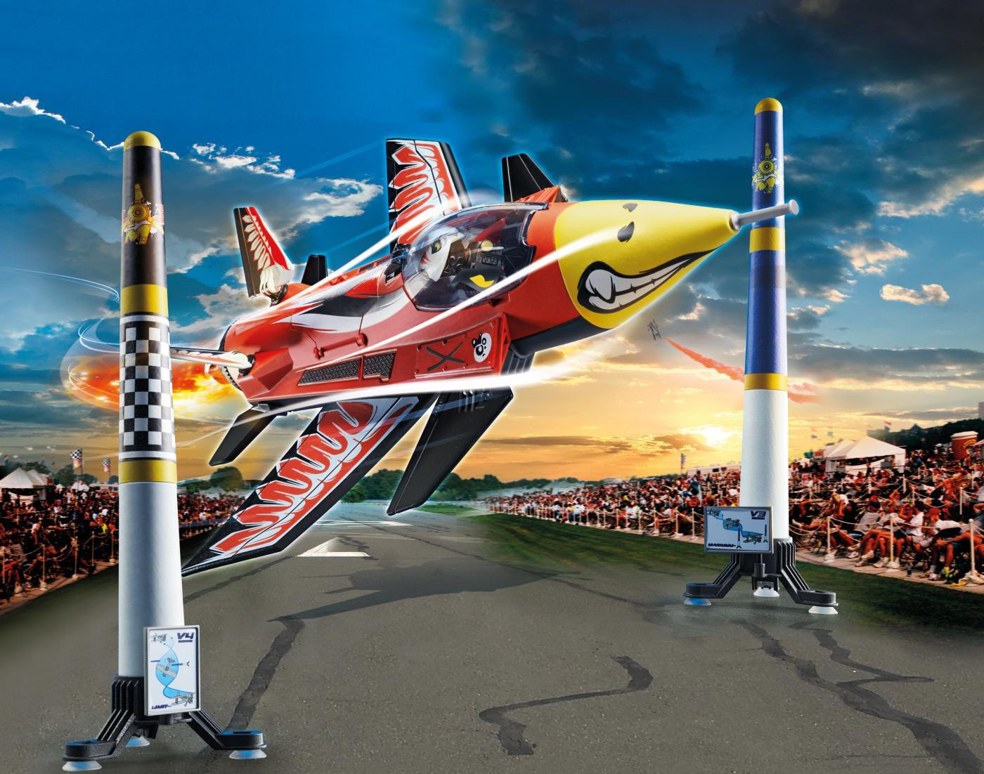 Είστε έτοιμοι για ακροβατικά; Ο πιλότος φοράει το κράνος του και επιβιβάζεται στο Air Stunt Show Τζετ Αετός. Βάζει σε λειτουργία τον κινητήρα και ετοιμάζεται για απογείωση. Στόχος του είναι να κάνει τα πιο εντυπωσιακά και πρωτότυπα ακροβατικά που θα κλέψουν την παράσταση στο σημερινό σόου. Με περιστρεφόμενο κινητήρα και δύο πυλώνες για καλύτερη εκπαίδευση στα ακροβατικά Διαστάσεις τζετ με τροχούς προσγείωσης: 40 x 38 x 14cm Το σετ περιλαμβάνει έναν πιλότο Playmobil, ένα τζετ με περιστρεφόμενο κινητήρα, δύο μεγάλους πυλώνες, ένα κράνος και άλλα απίθανα αξεσουάρ για περισσότερη διασκέδαση.