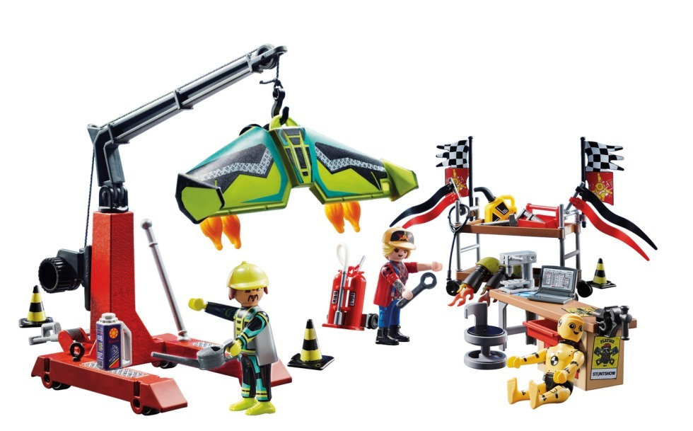 Εδώ συντηρούνται και επισκευάζονται όλα τα ακροβατικά αεροπλάνα. Περιλ. γερανός με βαρούλκο και μία κούκλα για crash test. Στο Air Stunt Show Συνεργείο, συντηρούνται και επισκευάζονται όλα τα αεροσκάφη. Μόλις έφτασε ένας πιλότος με το wingsuit που παρουσίασε βλάβη κατά την απογείωση. Ο μηχανικός σηκώνει πολύ προσεκτικά το wingsuit με τον γερανό για να το ελέγξει από όλες τις πλευρές. Υπάρχει βλάβη στο δεξί φτερό, χρειαζόμαστε άμεσα ένα εξειδικευμένο ανταλλακτικό. Ευτυχώς, το συνεργείο διαθέτει όλα τα απαραίτητα εξαρτήματα για την επισκευή του. Το σετ παιχνιδιού περιλαμβάνει δύο φιγούρες PLAYMOBIL, ένα wingsuit, έναν γερανό με βαρούλκο, μία εργαλειοθήκη και πολλά άλλα εργαλεία.