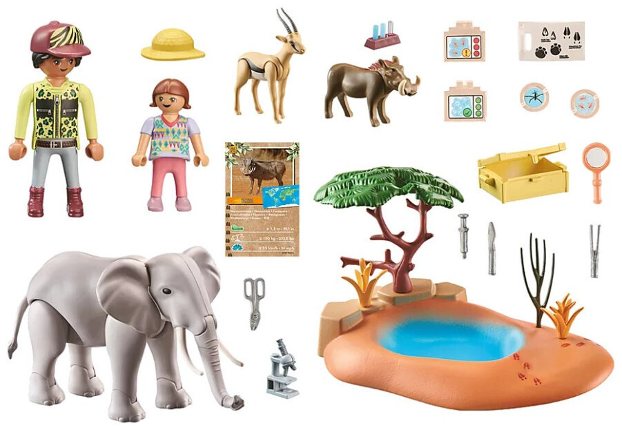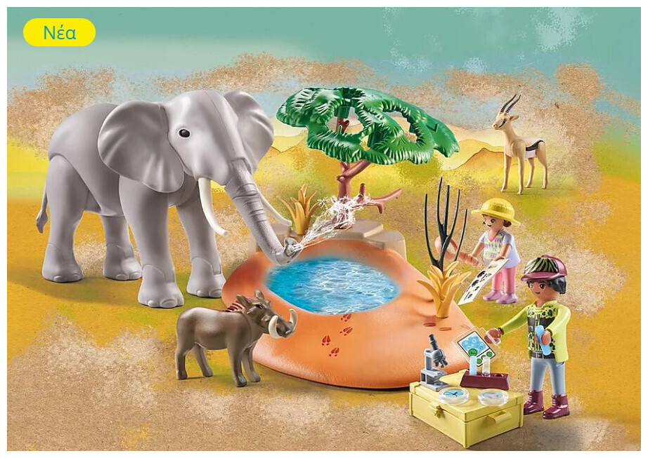 Ο ελέφαντας ρουφάει νερό με την προβοσκίδα του και το εκτοξεύει μακριά. Στη συσκευασία περιλαμβάνονται: Φακόχοιρος Αντιλόπη Διάφορα αξεσουάρ
